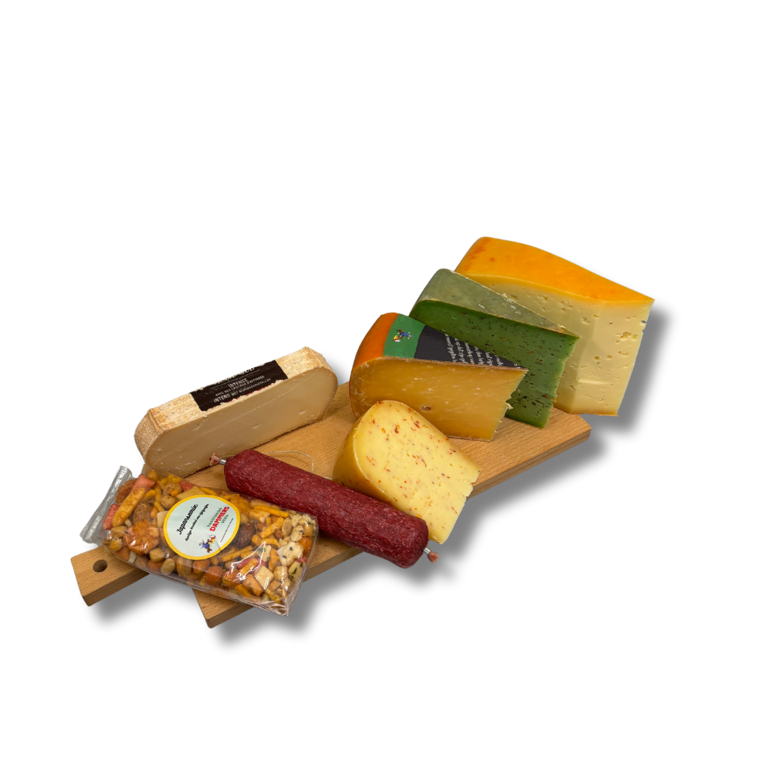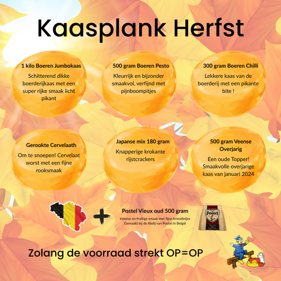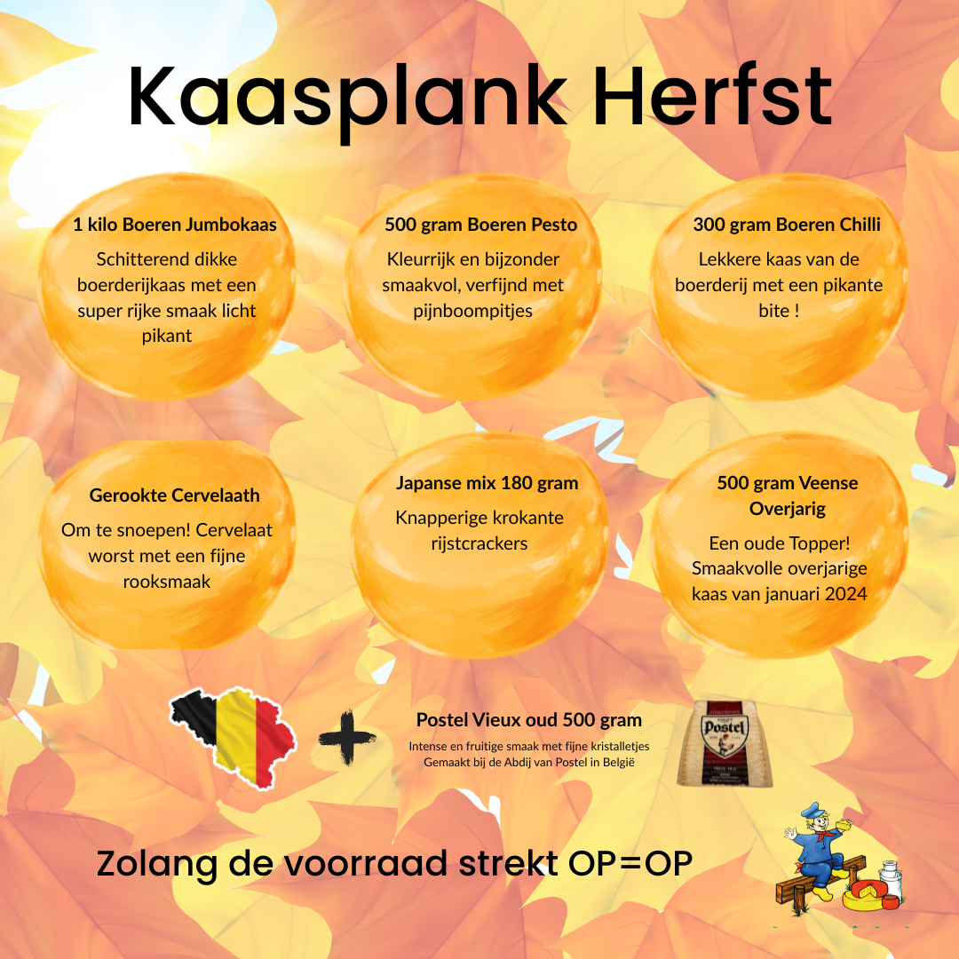 Proef de herfst! Een rijk gevulde kaasplank met boerenkazen, abdijkaas, cervelaat en Japanse mix – puur genieten.